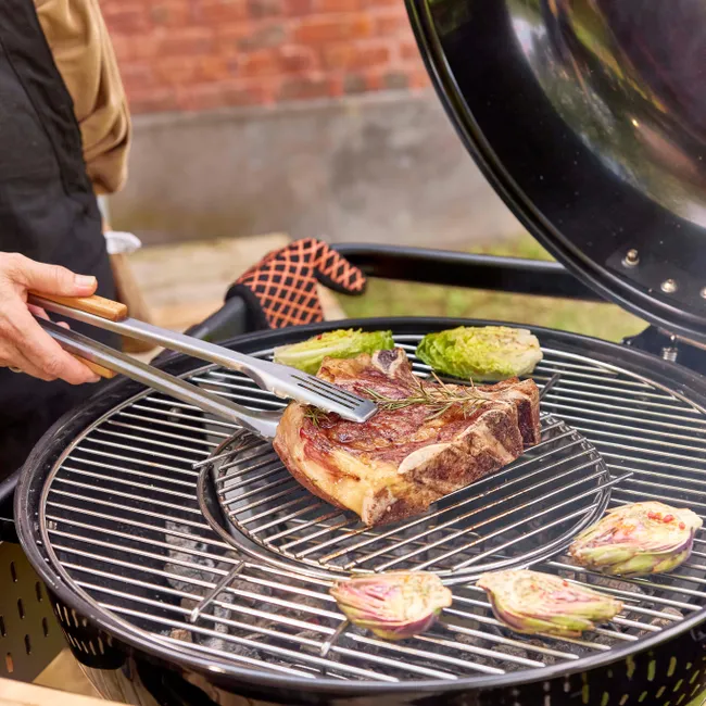 A cozedura direta permite selar os ingredientes rapidamente, colocando-os diretamente na grelha, em contacto com o calor. Equipado com uma grande tigela de aço e uma grelha de cozedura de 54 cm de diâmetro, permite-lhe defumar ou grelhar os seus alimentos enquanto desfruta de um calor uniforme. Tal como no forno, a cozedura indireta permite assar ou cozinhar ingredientes em lume brando. Os ingredientes não entram em contacto direto com a fonte de calor. Este tipo de confeção é ideal para preparar grandes pedaços de comida, como carne de vaca, mas também pizza, legumes ou sobremesas na grelha. Graças à sua tampa articulada, permite também cozinhar e cozinhar em lume brando, além de facilitar o manuseamento dos alimentos.