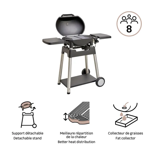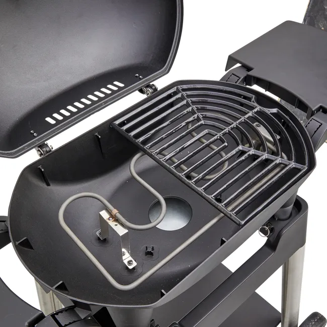 Equipado com um carrinho, este churrasco Hyperion elétrico encontrará seu lugar na sua varanda e naturalmente em seu jardim! A ausência de chamas é bastante tranquilizadora e seu tamanho sem importância. Não importa seus desejos, descubra um mundo de sabores em todas as ocasiões! Se compacto e tão prático Ideal para cozinhar uma refeição para 8 pessoas, mesmo em pequenos espaços, oferece, portanto, uma alternativa apreciável para provar grades deliciosas sem ter churrasco tradicionais. Este churrasco elétrico possui um modo de cozimento duplo que permite manter o calor uniforme. Sua tampa com termômetro incluída garante cozimento rápido e preciso. Ativos técnicos As grandes alças localizadas nos dois lados da grelha e seu peso leve permitem que você mova seu churrasco sem esforço. Os dois tablets laterais removíveis permitem armazenar seu churrasco sem ocupar muito espaço em casa. O coletor de gordura removível facilita a recuperação de gorduras, óleos e permite uma limpeza mais simples. Sua lareira totalmente esmaltada é uma garantia de longevidade, porque resiste à ferrugem e altas temperaturas. Dicas de manutenção Sua tanque lisa e esmaltado facilita a limpeza. Para preservar as propriedades qualitativas e estéticas do seu churrasco, é recomendável o inverno em um lugar longe da umidade ou usar uma cobertura à prova d’água apropriada. Para facilitar a limpeza, a grade é retirada para lavar a máquina de lavar louça.