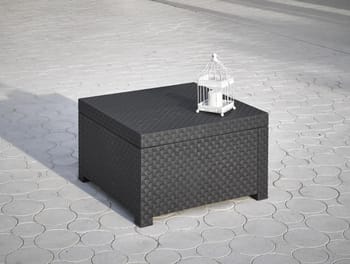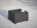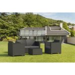 | Composição do conjunto | Conjunto de rattan em trançado composto por duas poltronas individuais, um sofá de dois lugares e uma mesa lateral. |