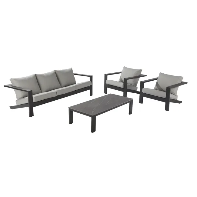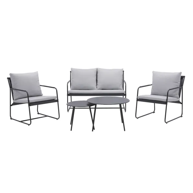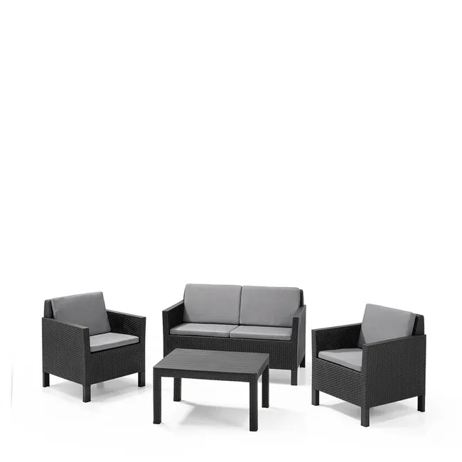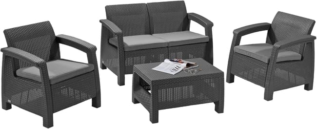 Conjunto de jardim relax NATERIAL, ideal para varanda, terraço ou jardim. Constituído por uma mesa (50X40cm), 2 cadeirões (74X79X66cm) e um sofá de 2 lugares (132X79X66cm). Em resina injectada, polipropileno cinzento grafite, sendo estes materiais leves fáceis de mover e resistentes às intempéries, não enferrujando. Com este set são poupadas cerca de 700 toneladas de plástico por ano. 60% da estrutura efectuada com coberturas de estufas de plástico. Poupança dos recursos naturais e reciclagem de produtos poluentes.