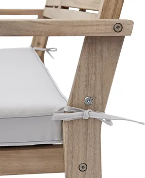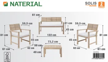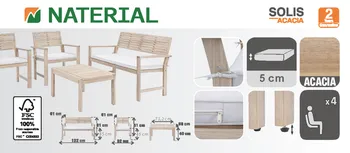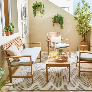 Compartilhe um brunch amigável ou simplesmente relaxe no mobiliário baixo de jardim Solis. Composto por um sofá, duas poltronas e uma mesa de centro, convida-o a desfrutar dos seus espaços exteriores. Um conjunto de mobiliário de jardim natural e resistente, as linhas naturais do mobiliário de jardim Solis permitem-lhe encontrar facilmente o seu lugar no seu jardim, perto da sua piscina ou no seu terraço. Seu sofá, projetado para acomodar 2 pessoas, e suas duas poltronas individuais possuem encosto em ripas finas que garantem um bom suporte. As almofadas são confeccionadas em poliéster e receberam tratamento anti-UV e hidrorrepelente para retardar a descoloração e permitir a limpeza imediata de manchas acidentais. Para garantir a harmonia, o tampo da mesa de centro possui duas fileiras de ripas finas e circundadas. As suas pernas quadradas conferem-lhe maior estabilidade, respeitando a naturalidade do seu estilo. Todo o mobiliário é feito em madeira de acácia proveniente de florestas certificadas pela sua gestão responsável e sustentável. Semelhante à teca, esta madeira possui alta densidade o que a torna muito resistente à hhumidade e aos raios UV. Este conjunto de jardim é feito em madeira de acácia. A naturalidade do material confere um aspecto cru e acolhedor aos seus espaços. Combine o seu conjunto com o guarda-sol Agora. Dicas de manutenção para garantir longa vida aos seus móveis, recomenda-se prepará-los para o inverno durante longos períodos de inatividade. A madeira de acácia é muito resistente, mas pode perder o brilho. Para evitá-lo, recomenda-se alimentá-lo anualmente com óleo de teca ou linhaça. Preserve sua cor natural aplicando um stripper anualmente. Por fim, devido à natureza viva da madeira, é recomendado apertar anualmente os parafusos do seu conjunto. A sua vantagem ambiental A acácia é um material vivo, 100% reciclável. É certificada a partir de florestas cuja gestão é reconhecida como responsável e sustentável em três áreas: social, ambiental e económica. Perante alertas ambientais ligados à desflorestação, uma organização independente controla a rastreabilidade dos produtos através de uma rigorosa política madeireira para garantir a sua origem legal e responsável. Com sede no Vietname, o nosso fornecedor está comprometido desde 2009 no processo de certificação e construiu parcerias sustentáveis ​​com subcontratados e fornecedores locais