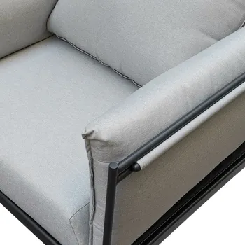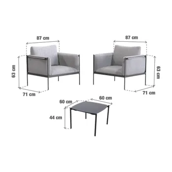 O conjunto de jardim baixo Levo é ideal para pequenos espaços. Inclui uma mesa de café e duas poltronas e foi concebido para oferecer um conforto óptimo. Um assento confortável O conjunto de jardim baixo Levo é perfeito para um pequeno terraço. É composto por uma mesa de café com tampo de vidro, que lhe dá uma superfície plana e estética, e duas poltronas. Cada poltrona tem um grande assento textileno flexível e 4 almofadas, 2 das quais são apoios de braços. São em poliéster, tratados com anti-UV para diminuir a descoloração e repelentes à água. Têm também um tocar mais suave e um aspeto visual semelhante ao do algodão. A estrutura do conjunto é de aço, o que oferece durabilidade e resistência ao seu conjunto. Linhas puras Simples e retilíneo, o design do conjunto Levo dá aos seus espaços um caráter moderno. Combine-o com o chapéu de sol Arkea para um resultado harmonioso. Dicas de manutenção Para assegurar uma longa vida útil ao seu mobiliário, aconselhamos a invernizá-lo sob uma capa impermeável Naterial. As almofadas são totalmente removíveis para facilitar a limpeza. A estrutura das almofadas pode ser facilmente limpa com um pano ligeiramente humedecido e sabão neutro. Em caso de corrosão, aplicar imediatamente um tratamento anti-ferrugem na área afetada.