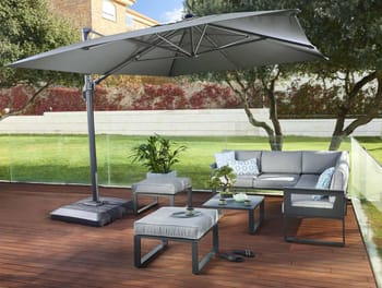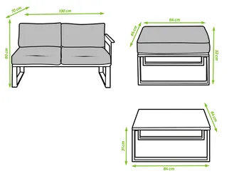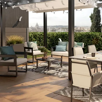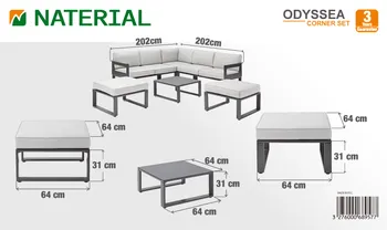Com a sua família ou amigos, reúna-se para desfrutar de momentos de convívio com o Odyssea corner lounge! Ao ar livre ou sob a pérgula Odyssea, o seu design associado à sua cor antracite traz aos seus espaços exteriores um toque moderno e acolhedor. Um salão de canto completo. Desfrute de um momento de relaxamento confortavelmente instalado no salão de canto Odyssea. Composto por um sofá, uma mesa de centro e dois pufes individuais, é perfeito para relaxar numa tarde ensolarada. Ideal para 5 pessoas, o sofá de canto possui um revestimento acolchoado em têxtil que proporciona um elevado nível de conforto, reforçado pela presença de almofadas nas costas e no assento. Projetados em poliéster, são tratados com um tratamento anti-UV e repelente à água que retarda o desbotamento e permite limpar imediatamente manchas acidentais. O móvel baixo de jardim Odyssea também possui dois apoios de pés, que permitem acomodar mais duas pessoas onde quiser. Têm as mesmas características do sofá e são leves: você pode movê-los com uma simples mão. Completo, o mobiliário de jardim Odyssea inclui uma mesa de centro. Ideal para um aperitivo entre amigos, permite ter uma superfície muito prática a qualquer momento. Para maior resistência às variações climáticas, todos os elementos são fabricados em alumínio. Este material robusto é resistente à hhumidade e à ferrugem e é muito fácil de limpar. Um design angular, as linhas do mobiliário baixo de jardim Odyssea são puras. As pernas e braços têm formato de “U”, o que reforça o estilo geométrico e moderno do conjunto. Combine o seu conjunto com a Pergola Odyssea para um resultado harmonioso. Dicas de manutenção para preservar seus móveis, recomenda-se prepará-los para o inverno sob uma capa respirável Naterial durante longos períodos sem uso. Da mesma forma, as almofadas são totalmente removíveis e devem ser protegidas da humidade quando não estiverem em uso. O alumínio pode ser facilmente limpo com pano úmido e produto neutro. É feito com materiais leves e resistentes ao mesmo tempo. Sua estrutura de alumínio resiste à ferrugem. Abaixo das almofadas, a área de assento é confeccionada em têxtil para realçar sua maciez. A área de estar e o encosto são confeccionados em têxtil acolchoado. Este tecido de PVC oferece excelente conforto ao sentar, resiste aos elementos climáticos e pode ser limpo facilmente