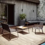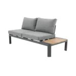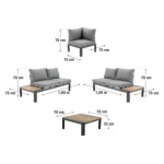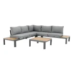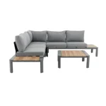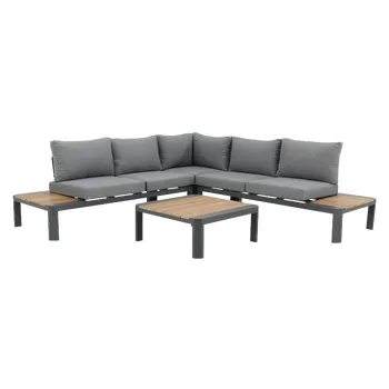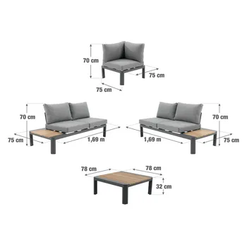 Acomode confortavelmente 5 pessoas no mobiliário baixo de jardim Bali! Composto por um sofá de canto e uma mesa de centro, permite economizar espaço enquanto desfruta de uma confortável e moderna área de relaxamento. Um sofá confortável e moderno O mobiliário baixo de jardim Bali acompanha-o nos seus momentos diários. Quer seja uma refeição ou uma pausa ao sol, o sofá de canto tem grandes prateleiras nas laterais para colocar os seus óculos de sol, um livro ou uma bebida, enquanto a mesa permite colocar a sua louça. Assim como a mesa de centro, são feitas em teca, madeira resistente às variações climáticas como frio e humidade, e alumínio, material forte, leve e durável. Os encostos, feitos em placas de alumínio, são arejados e individuais para que cada um tenha seu espaço. Suas almofadas grossas têm uma cor cinza que combina harmoniosamente com a mistura teca-alumínio do conjunto. A teca selecionada para esta série provém de florestas certificadas pela sua gestão responsável e sustentável. Um estilo industrial Projetado com inspiração industrial, o conjunto Bali representa a aliança entre conforto e estética. A sua forma angular permite-lhe instalá-lo facilmente no seu jardim ou no seu terraço para um ambiente moderno. A combinação da madeira antracite e teca confere ao seu conjunto um estilo contemporâneo e acolhedor. Para um resultado harmonioso, combine-o com o guarda-sol Sonora LED. Dicas de manutenção: para preservar o seu mobiliário baixo de jardim Bali, é recomendável protegê-lo durante longos períodos de inatividade. Recomenda-se também nutrir a madeira, uma ou duas vezes por ano, aplicando óleo de teca ou linhaça. Para preservar a cor e evitar que fique cinza, pode-se usar um limpador de madeira. As almofadas são removíveis e podem ser facilmente limpas com lavagem à máquina a frio. Suas vantagens ambientais A teca, material vivo e 100% reciclável, é certificada como proveniente de florestas cuja gestão é reconhecida como responsável e sustentável em três níveis: social, ambiental e econômico. Perante alertas ambientais ligados à desflorestação, uma organização independente controla a rastreabilidade dos produtos através de uma rigorosa política madeireira para garantir a sua origem legal e responsável