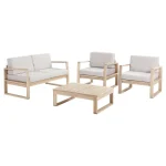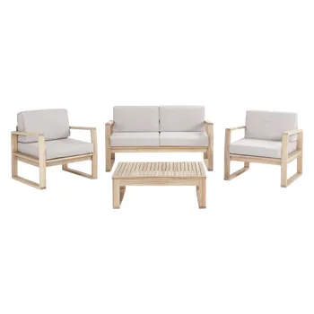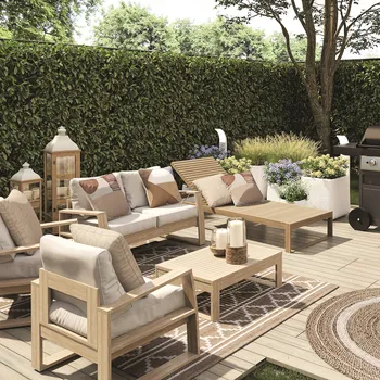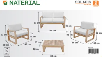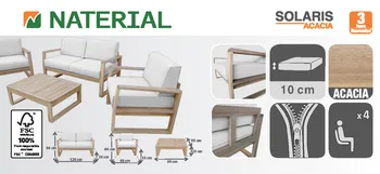O conjunto de jardim com assentos baixos NATERIAL Solaris é composto por um sofá para duas pessoas, duas poltronas e uma mesa baixa. É fornecido com 4 almofadas de assento e 4 almofadas de encosto com capas amovíveis, feitas de poliéster impermeável. A sua base quadrada confere-lhe um aspeto simultaneamente estilístico e robusto, combinando na perfeição com a mesa NATERIAL Solaris. Os produtos das gamas NATERIAL Solis e Solaris são fabricados em madeira de acácia certificada FSC. O óleo de acabamento mantém o aspeto dourado natural da madeira. O rótulo FSC permite fazer escolhas informadas em relação a produtos provenientes de uma gestão florestal ambientalmente correcta, socialmente benéfica e economicamente sustentável.
