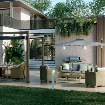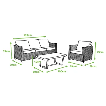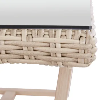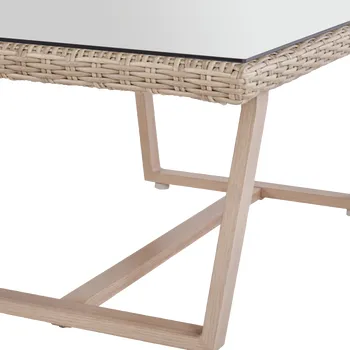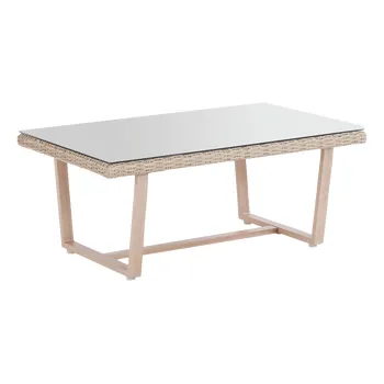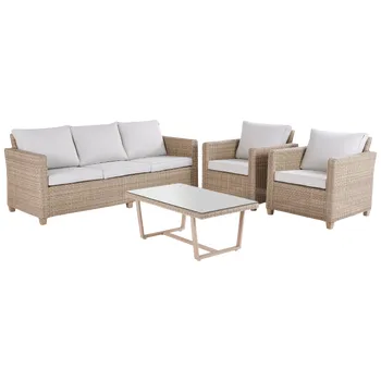 Faça a escolha do conforto com os móveis de jardim Medena! Composto por um sofá de canto onde você pode relaxar, uma mesa de centro e duas poltronas confortáveis, o conjunto Medena pode acomodar até 5 pessoas. Um salão de canto completo e confortável Composto por um grande sofá de 3 lugares, uma mesa de centro e 2 poltronas individuais, este conjunto permite desfrutar de momentos quentes ao ar livre. Influenciado pelo rattan, seu trançado é feito de resina de polietileno em formato meio redondo para um visual mais realista e um toque muito agradável. Suas almofadas têm efeito algodão, para um toque macio e reconfortante. Fabricados em poliéster, foram tratados com um tratamento anti-UV e repelente à água, que retarda o desbotamento e permite limpar imediatamente manchas acidentais. A mesa está equipada com um vidro transparente que mostra o acabamento natural do efeito rattan, ao mesmo tempo que oferece uma superfície plana para uma utilização prática. Feito inteiramente de alumínio, foi projetado para resistir aos caprichos do clima. Este material, conhecido pela sua resistência e leveza, permite deslocar a mesa com facilidade, de acordo com os seus desejos. Bem desenhado, está equipado com 4 pés reguláveis ​​para nivelar a mesa e protegê-la do contacto direto com o solo, de forma a garantir estabilidade em todos os momentos. Um estilo natural e acolhedor Seu design de inspiração boêmia combina formas retangulares e quadradas para criar o efeito de uma sala de estar autêntica, aconchegante e estética. Para um conjunto harmonioso, as pernas da mesa Medena, em formato de “U”, são feitas de alumínio com efeito madeira natural, o que amplifica o seu aspecto autêntico. Combine o conjunto Medena com o apoio de pés da mesma série. Dicas de manutenção Para preservar a qualidade e as propriedades estéticas dos seus móveis, recomenda-se preparar o conjunto de canto Medena para o inverno em local protegido da humidade ou protegê-lo com uma capa impermeável adequada. Da mesma forma, as almofadas são totalmente removíveis e devem ser protegidas da humidade quando não estiverem em uso. Para garantir uma escolha viável e durável, as peças de reposição Medena estão disponíveis mediante solicitação como parte da garantia. As almofadas são acolhedoras e confortáveis, com um toque muito suave de “efeito algodão”. As almofadas são totalmente removíveis para fácil manutenção. Tecidos de poliéster, com tratamento anti-UV e hidrorrepelente, para resistir às intempéries