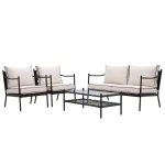 Um móvel de jardim romântico e simpático para receber os seus convidados rodeados pela natureza Tome um chá confortavelmente instalado no meio das plantas Pensado para criar um espírito romântico neoclássico, o mobiliário de jardim Victoria inclui um sofá para duas pessoas, duas poltronas individuais bem como uma mesa de café. Suas grandes almofadas brancas proporcionam um conforto ideal. Fabricados em poliéster, possuem tratamento anti-UV e repelente à água, permitindo limpar facilmente tarefas acidentais, e aderem à estrutura para permanecer no lugar mesmo em caso de vento. A mesa de centro Victoria e sua bandeja de vidro de fácil manutenção, deixam aparecer um trançado com efeito couro preto no piso inferior, permitindo instalar revista e sustentar o estilo bucólico do conjunto. Um charme tradicional Inspirado nos jardins ingleses, o conjunto Victoria traz um toque romântico aos seus exteriores e varandas. Seu aço preto reforça o efeito ferro forjado e associa-se ao tom branco das almofadas, cuja costura preta lembra a estrutura e vem para modernizar o conjunto. Para um conjunto bucólico completo, combine este mobiliário de jardim com a zona de jantar Victoria, com mesa e cadeiras que retomam o estilo e as vantagens da gama. Dicas de manutenção Práticos, os móveis de jardim Victoria requerem pouca manutenção. Sua estrutura de aço é facilmente limpa com pano úmido e produto neutro. Recomenda-se passar o inverno nas almofadas em local seco durante o inverno. Suas almofadas removíveis podem ser lavadas na máquina. Para preservar a sua qualidade, lembre-se de cobrir o seu mobiliário de jardim com uma capa Naterial para protegê-lo das intempéries. No caso de um ponto de corrosão, certifique-se de usar imediatamente um tratamento antiferrugem para evitar que se espalhe.