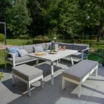 Desfrute de momentos de convívio ao ar livre com o conjunto de mobiliário de canto para jardim Naxos II.