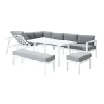 Com o seu alumínio branco, almofadas cinzentas e linhas retas, o conjunto de mobiliário de canto para jardim Naxos II dará um toque contemporâneo ao seu jardim. Combine-o com o guarda-sol Sonora Led para criar um espaço completo e harmonioso. Modular, este conjunto é multiusos para se adequar a todas as suas atividades.