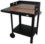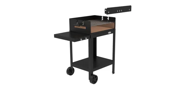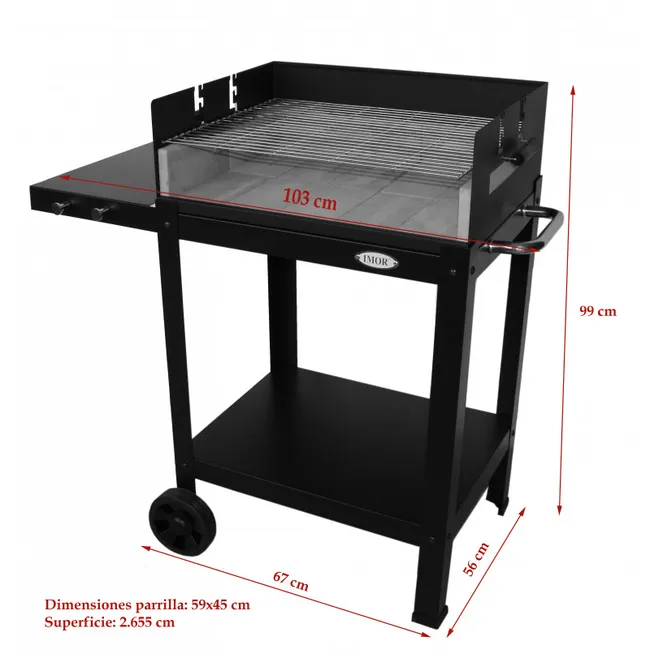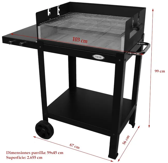 Churrasco de MDF e carvão, em aço esmaltado. Equipado com uma grade cromada com alças de proteção e ajustável em três posições diferentes e uma prateleira de suporte lateral e uma menor. Na base do churrasco, há o tijolo refratário. Equipado com ganchos para pendurar acessórios e duas rodas com alça de transporte. Altura da grade ajustável em 3 posições. Contém uma grade grelhada cromada. Equipado com duas rodas. Com tijolo refratário Dim. Produto 99 x 56 x 67 cm dim.