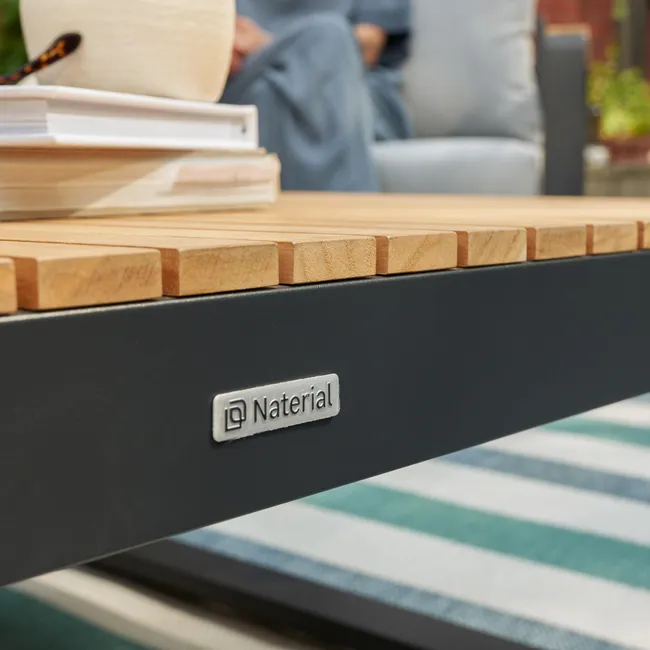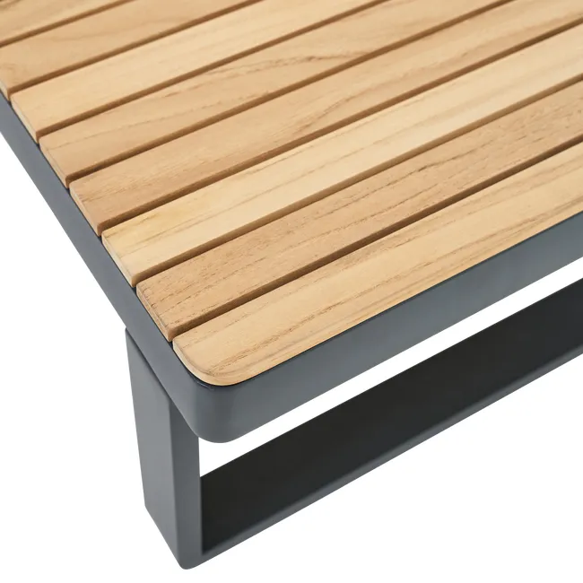Crie um espaço acolhedor e funcional com a mesa de centro retangular Persea. Com as suas dimensões compactas, esta mesa de centro é ideal para acompanhar a linha de mobiliário de jardim Persea, para manter as suas bebidas ou tábuas de aperitivos por perto. Feita de alumínio antracite com tampo em teca, esta mesa é leve e fácil de mover.