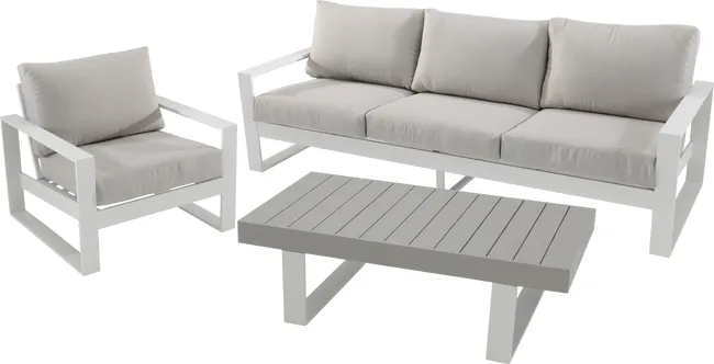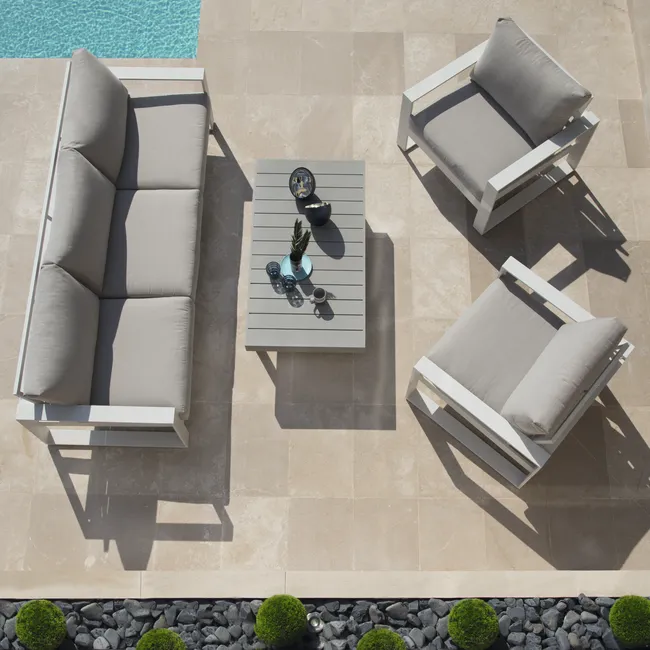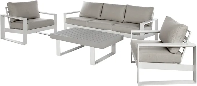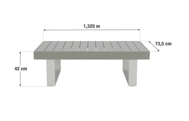 Concebida para combinar com os restantes artigos da gama LAS VEGAS, use-a como uma mesa de centro nos seus conjuntos de relax. A estrutura em alumínio é a garantia da sua resistência à ferrugem e às condições meteorológicas durante anos e anos.