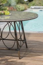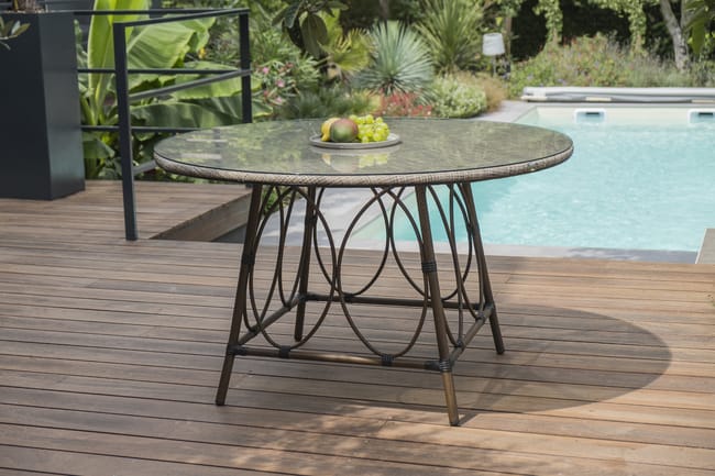 Mesa redonda de jardim em alumínio castanho com tampo em vidro e têxtil. DIMENSíƒâ€¢ES D 125 x A 74 cm