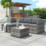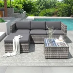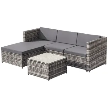 Salão de jardim em resina trançada – Sofá de canto exterior com mesa de centro – 4 lugares – Cinza
