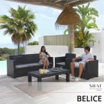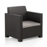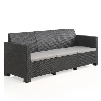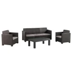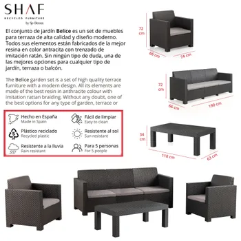 Set de muebles de jardín diseñados para balcones y terrazas. Productos de alta calidad y diseño moderno, fabricados de la mejor resina en color grafito con trenzado de imitación ratán. Conjunto formado por un sofá de 3 plazas, dos sillones individuales y una mesa baja de centro. Además, se incluyen cojines. Mobiliario fabricado en España con un 80% de plástico reciclado. Color: Grafito. Medidas sofá (AlxProfxL): 72x66x190 cm. Medidas sillón (AlxProfxL): 72x66x74 cm. Medidas mesa (AlxProfxL): 34x63x118 cm.