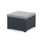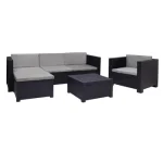 Conjunto Manhattan para decoración exterior de jardines y terrazas. Mobiliario de resina sin componentes metálicos para evitar la oxidación, fabricado en España con materiales reciclados. Set compuesto por un sofá de tres plazas, un sillón individual, un puf y una mesa baja de café. Además, se incluyen cojines para respaldo y asiento. Color: Grafito. Medidas sillón (AlxProfxL): 72x66x74 cm. Medidas sofá (AlxProfxL): 72x66x190 cm. Medidas mesa (AlxProfxL): 34x57x57 cm. Medidas puf (AlxProfxL): 39x56x56 cm.