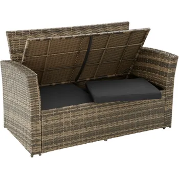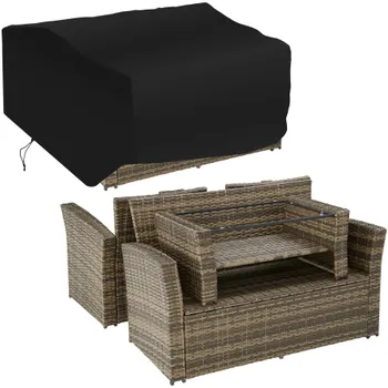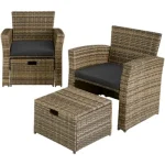 Este atraente conjunto de rattan da tectake combina um design moderno e atraente com elevado conforto. Procura um momento de paz e tranquilidade ao ar livre? Relaxe entre estas almofadas macias e os bancos em modo repousa-pés. Quando chegar a hora de arrumar o conjunto, basta empurrar os bancos para debaixo das poltronas e guardar convenientemente as almofadas impermeáveis no sofá. Este conjunto de rattan da tectake impressiona com sua fácil manutenção, trançado de alta qualidade em poli-rattan durável e sua estrutura de aço robusta.