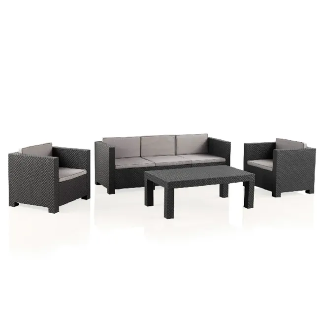 Adequado para uso interior e exterior graças à sua composição de resina injectada, o mobiliário de jardim Tropea Anthracite também tem uma estrutura de polipropileno. Com um assento confortável e resistente à água, as almofadas são removíveis, laváveis e feitas de tecido repelente à água.